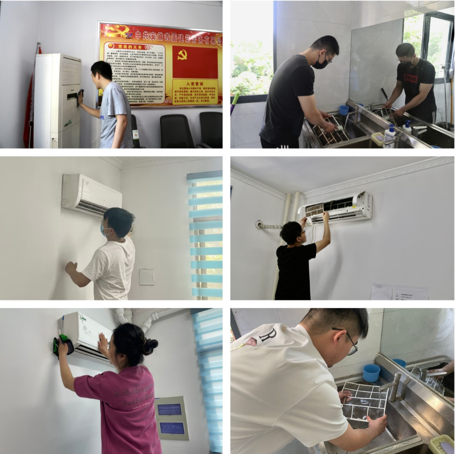 活動中,志愿者先對空調(diào)進行斷電,打開空調(diào)蓋板,取出空調(diào)濾網(wǎng),接著使用抹布和清洗劑對空調(diào)外機、濾網(wǎng)等部件進行全面細致的清洗。志愿者們在清洗的同時,還為同事們講解使用、保養(yǎng)空調(diào)等方面的知識。“長期不清洗空調(diào)會容易導(dǎo)致制冷效果下降,增加耗電、噪音,還有可能會產(chǎn)生異味,滋生細菌、螨蟲,危害身體健康。定期清洗空調(diào),可以延長空調(diào)的使用壽命,有益身體健康。”
