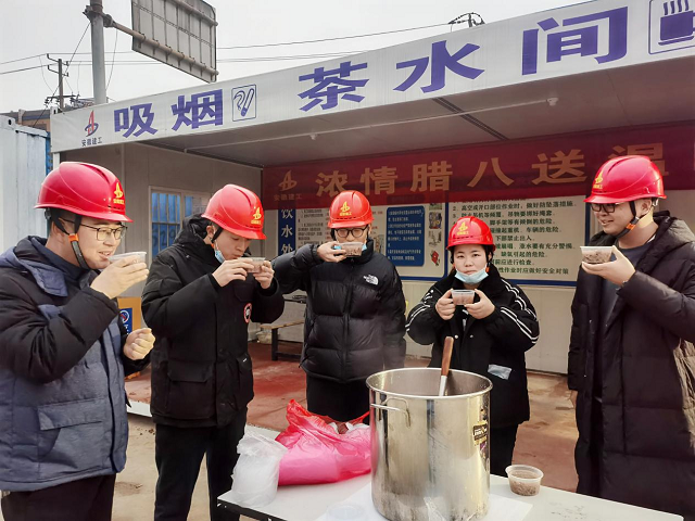 1月10日,安徽二建第三分公司銅陵水木清華園項(xiàng)目開展了“濃情臘八送溫暖”活動(dòng),為一線工友送上了節(jié)日的祝福和營養(yǎng)豐富、熱氣騰騰的臘八粥,感謝他們?yōu)楣こ探ㄔO(shè)的辛勤付出。