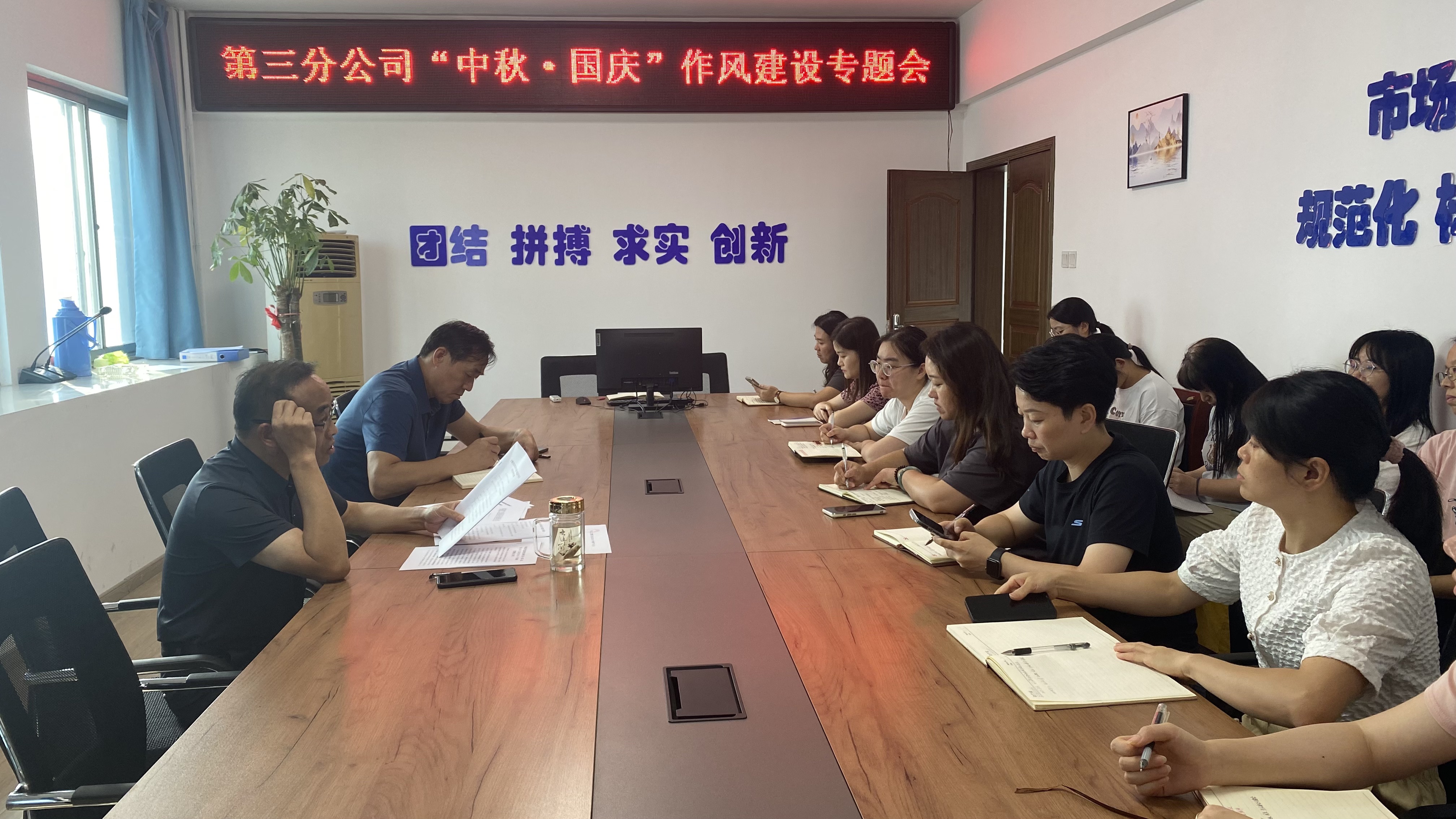 為進一步加強“中秋、國慶”期間紀律作風建設,增強分公司全員廉潔自律意識,營造風清氣正的節(jié)日氛圍,9月12日下午,第三分公司召開“中秋、國慶”節(jié)前作風建設專題會,會議由黨支部書記司圣華主持。