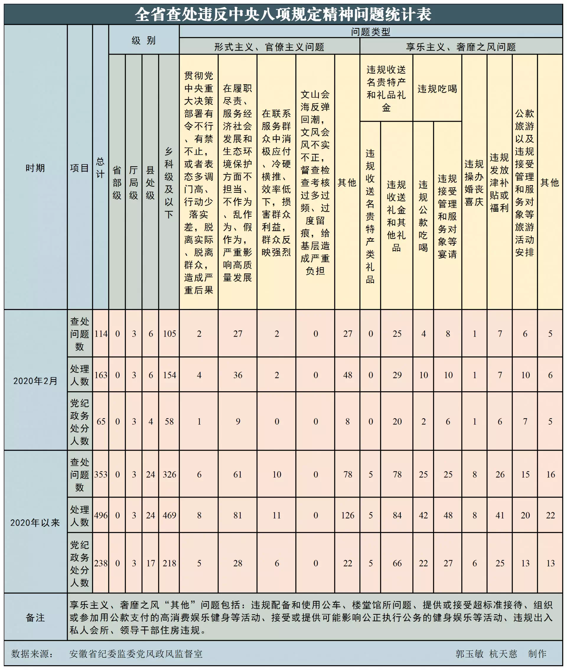 為掌握全省貫徹落實中央八項規(guī)定精神情況,安徽省紀委監(jiān)委在各省轄市和各省直機關、各省屬高校、各省屬企業(yè)建立了落實中央八項規(guī)定精神情況月報制度。2020年以來,截至2月29日,全省查處違反中央八項規(guī)定精神問題情況如下: