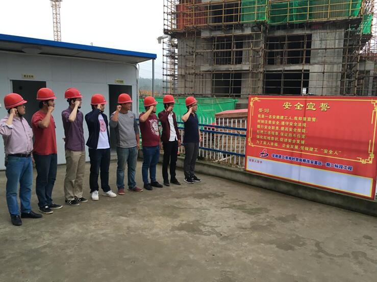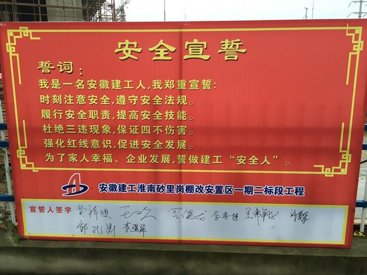 早上六點(diǎn),清晨第一縷陽光剛剛灑下,項(xiàng)目部管理人員已在安全宣誓牌前排列整齊,面對莊嚴(yán)的宣誓牌,全體成員在項(xiàng)目技術(shù)負(fù)責(zé)人王歡的帶領(lǐng)下,右手握拳置于面龐,鄭重地齊聲宣讀誓詞:我是一名安徽建工人,我鄭重宣誓:時(shí)刻注意安全,遵守安全法規(guī);履行安全職責(zé),提高安全技能;杜絕三違現(xiàn)象,保證四不傷害;強(qiáng)化紅線意識(shí),促進(jìn)安全發(fā)展;為了家人幸福,企業(yè)發(fā)展,誓做建工“安全人”。隨后,項(xiàng)目部全體成員在項(xiàng)目經(jīng)理費(fèi)祥琪的帶領(lǐng)下,陸續(xù)在宣誓牌上簽下了自己的名字,表明自己時(shí)刻謹(jǐn)記安全宣誓內(nèi)容,堅(jiān)持安全生產(chǎn)的決心。