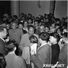 這是1956年9月27日,大會(huì)勝利閉幕,毛澤東步出會(huì)場(chǎng)時(shí),受到大會(huì)代表和工作人員們的熱烈歡迎(資料照片)。